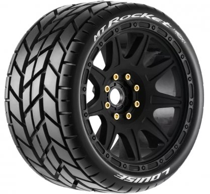 Louise RC - MFT - MT-ROCKET speed - 1-8 Monster Truck Tire Set - Mounted - Soft - Black Wheels - Removable 1-8 MT HEX 17mm - 0" & 1/2" OFFSET