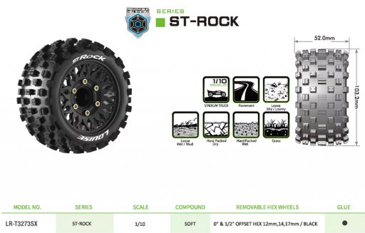 (LR-T3273SX) Louise RC - ST-ROCK - 1-10 Stadium Truck Tire Set - Mounted - Sport - Black Wheels