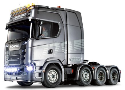 This R/C model assembly kit recreates the Scania 770 S 8x4/4, a double front-axle steering, double rear-axle drive eight-wheel heavy trailer head equipped with a 16.4-liter V8 turbo engine capable of 770hp, added in 2020 to the Swedish manufacturer Scania's top-grade S Series. The model has a highly realistic body with interior details, and a chassis featuring a ladder frame with aluminum side channels. Power is delivered to the two rear axles via a 3-speed transmission, while the two front axles are steered by a single servo; the second axle is a lift axle which can be manually raised and lowered.